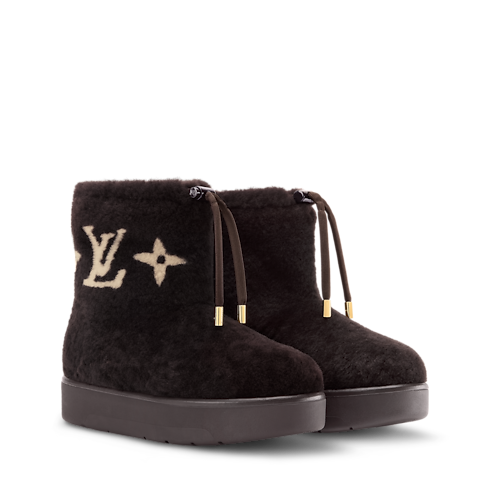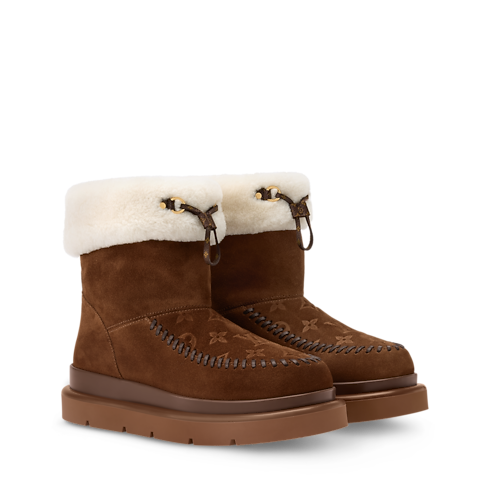 Wer Leichtigkeit sucht, entdeckt Hausschuhe mit weichem Innenleben und gepolsterten Sohlen, sowie In- oder Outdoor-Modelle wie den Romy Ballerina. Für kältere Tage finden Sie bei Louis Vuitton Stiefeletten wie die Star Trail Boots mit markanter Plateausohle und blockigem Absatz. Auch Varianten wie der Silhouette Ankle Boot oder die neuen Aspen Boots kombinieren wetterfestes Design mit feinen Details.