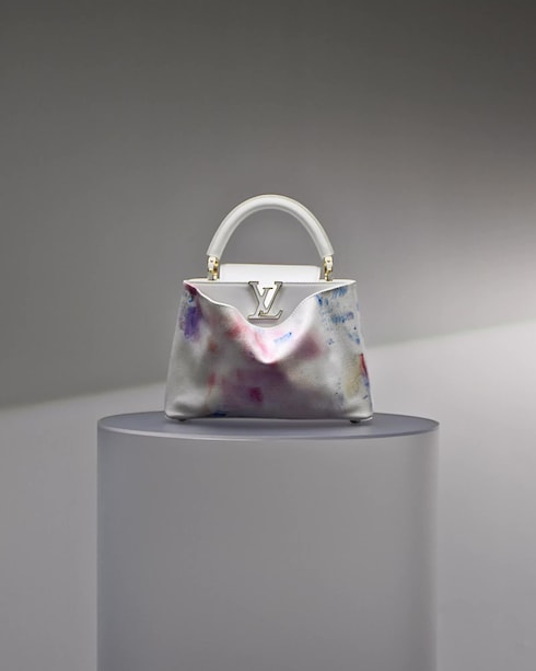 Die skulpturale Artycapucines von Liza Lou aus weichem, sorgfältig geprägtem Leder verweist auf die für sie charakteristische Perlenstickerei, die in Pastelltönen gedruckt ist und an ihre emblematischen Cloud Bilder erinnert. Die filigrane Textur schafft einen Kontrast zur eleganten Capucines Tasche und rahmt den ikonischen Louis Vuitton Verschluss perfekt ein.