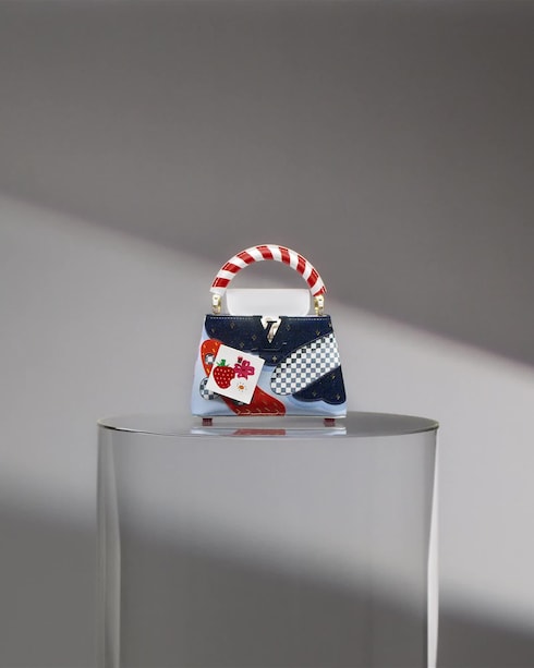 Auf spielerische Weise interpretiert Wang die Merkmale der Maison durch eine kaleidoskopische Linse neu. Die Mini Capucines, die bisher kleinste kreierte Artycapucines, vereint ein grafisches Motiv, das dem ikonischen Damier Muster nachempfunden ist, mit chromatischen Applikationen. Die Kreation erinnert an Bonbonpapier und Bonbons und ist von einer gewissen Skurrilität geprägt.