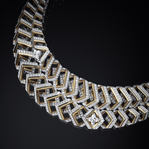 Dynamisme spiegelt den modernen Kollektivismus der Epoche wider und erinnert an das Phänomen des Reisens, mit dem Louis Vuitton an die Spitze der Innovation gelangen konnte. DIe strukturierte Halskette schafft mit ihren präzise ausgerichteten Gliedern und den Diamanten im LV Monogram Star-Schliff eine grafische Darstellung der Verbundenheit und unterstreicht mit ihrem zweisträngigen 3D-Chevron-Motiv handwerkliche Kunstfertigkeit, während Platin und Gelbgold die kantige Ausrichtung unterstreichen.