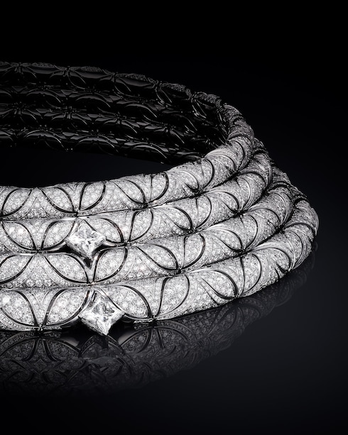 Die Geschwindigkeit der Moderne sowie die rasche Industrialisierung durchdringen die klaren und hypnotischen Designs von Fréquence, in Form einer 4-reihigen Halskette, die das ikonische Drachenmotiv der Maison aufgreift. Strahlende Diamanten vereinen sich zu einer subtilen Hommage an die symbolträchtige Monogramblüte.