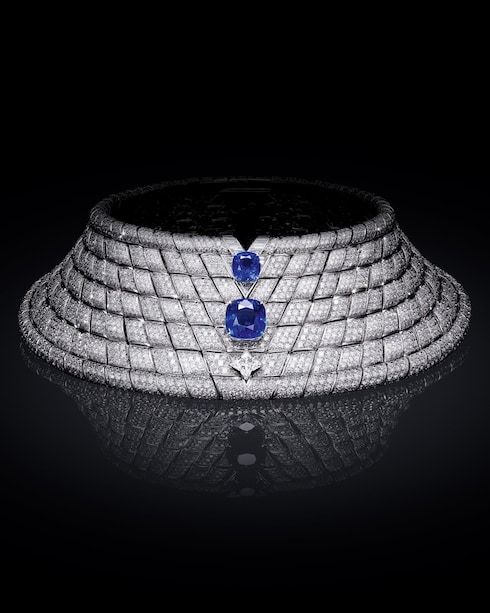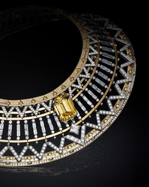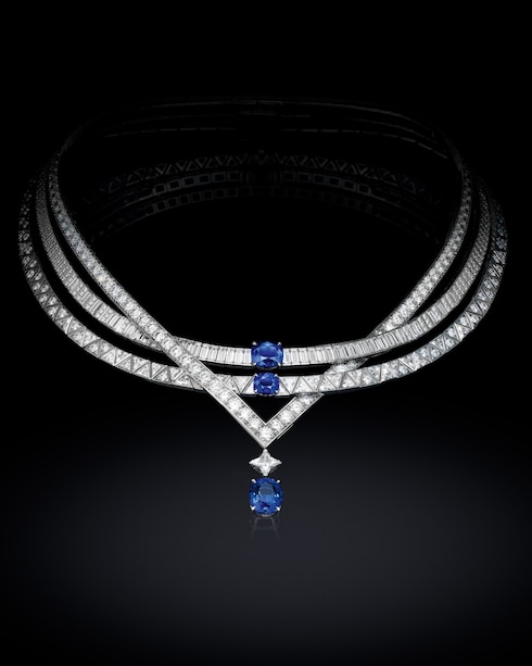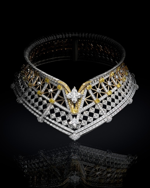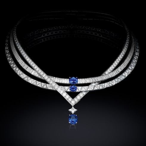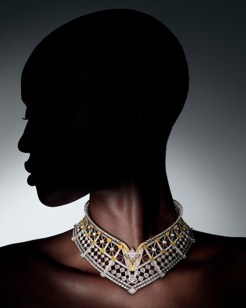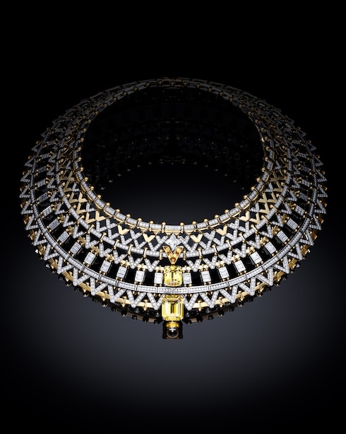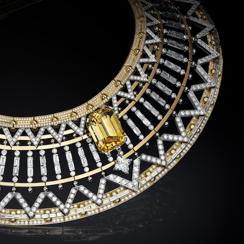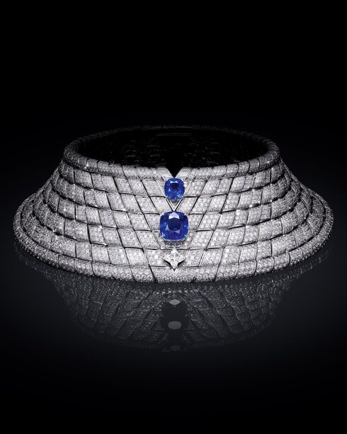 Vision verkörpert den Reisegeist von Louis Vuitton und taucht ein in die Expansion der Eisenbahn und das neu entdeckte Gefühl von Freiheit und Entdeckung. Verflochtene V-förmige Glieder werden mit luxuriösen Nieten, die an die Kofferfertigung der Maison erinnern, zu einer eindrucksvollen Halskette verarbeitet, die von goldgelben Saphiren veredelt wird.