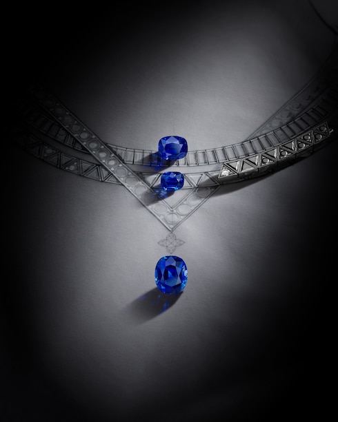 Als Verkörperung des wissenschaftlichen Fortschritts der Mobilität im 19. Jahrhundert enthüllt die Präzision von Gravité ein subtiles Spiel der Überlagerungen von Edelsteinen und Metallen. Der Glanz der seltenen Saphire wird durch Fassungen und Diamanten unterschiedlicher Größe intensiviert und durch die V-Signatur der Maison veredelt.