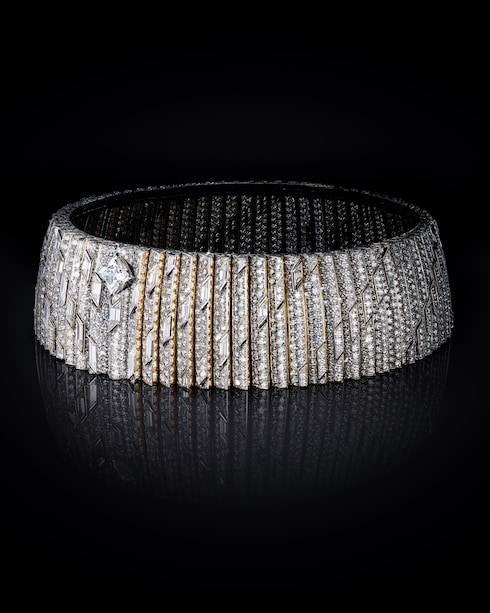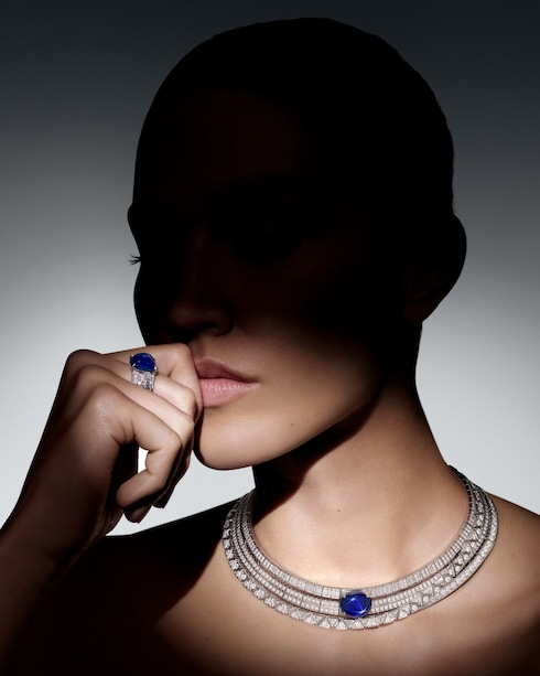 Perception greift das Gefühl der Bewegung und des rasanten Tempos der Epoche durch sich wiederholende geometrische Muster auf - umgesetzt in einem faszinierenden Mix aus Diamanten. Einzigartige Saphir Edelsteine leuchten in einem samtigen Blauton und bilden das Herzstück.