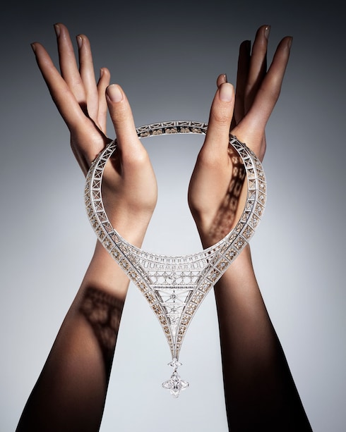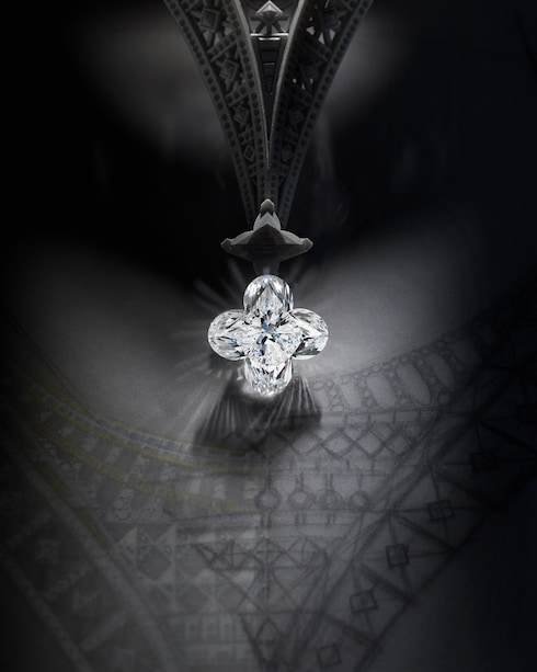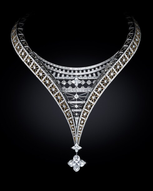Victoire ist dem ikonischen französischen Wahrzeichen nachempfunden und nimmt die Bewegung des Eiffelturms in einer einzigartigen, umgekehrten Perspektive mit einer bemerkenswerten V-förmigen Halskette auf. Der außergewöhnliche 15,16-karätige Stein D IF, wurde in Form der Monogram-Blüte geschliffen.