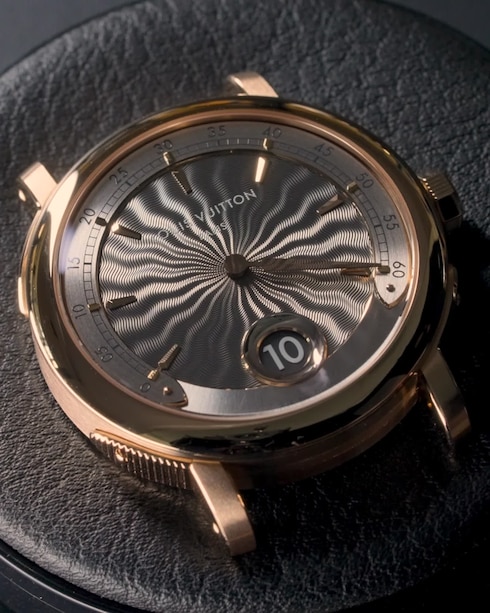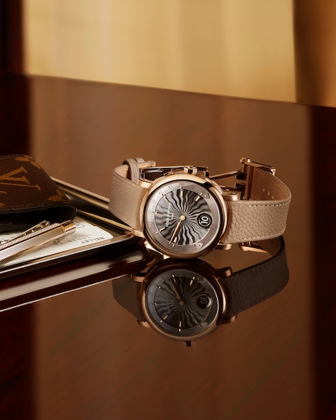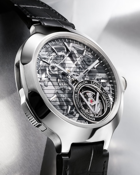 Die Louis Vuitton Escale Minute Repeater ist ein ikonischer Ausdruck des Savoir-faire der Maison und kombiniert ein exquisites Handaufzugskaliber mit einer springenden Stunden- und einer retrograden Minutenanzeige. Vom strahlenden Guilloché-Zifferblatt bis hin zur vom Koffer inspirierten Minutenskala spiegelt jedes Detail den Dialog zwischen Form, Klang und Zeit wider. Die Uhr wurde von Louis Vuitton und Gérald Genta gemeinsam entworfen.