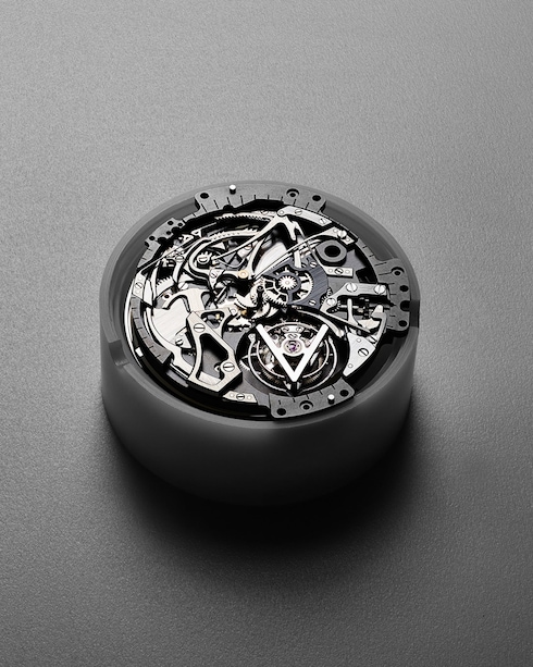 Dieser außergewöhnliche Zeitmesser vereint zwei Welten: modernes Design und bewährte Handwerkskunst. Er stellt zwei Ikonen der hohen Uhrmacherkunst in den Mittelpunkt: ein fliegendes Tourbillon und ein Schlagwerk-Mechanismus, der als sogenannter 'Minute Repeater' bekannt ist.