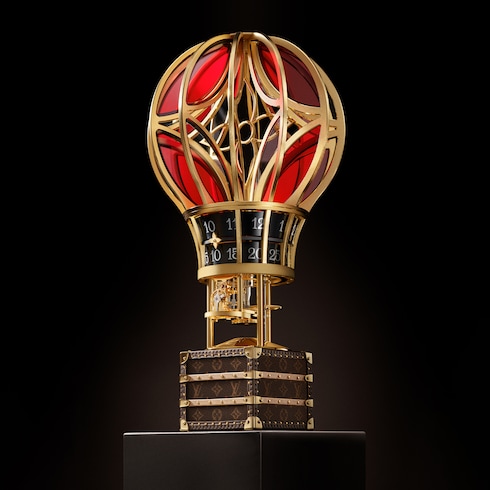 Die Montgolfière Aéro in zeitlosem Rot und klarem Glas ist eine Hommage an den Heißluftballon, der die Kampagnen und Kreationen der Maison im Laufe der Geschichte inspiriert hat. Die Kreation ruht auf einem Korb, der an einen der kleinsten Louis Vuitton Trunks erinnert, die je hergestellt wurden. Vervollständigt durch das ikonische Monogram Canvas sowie den traditionellen Details.