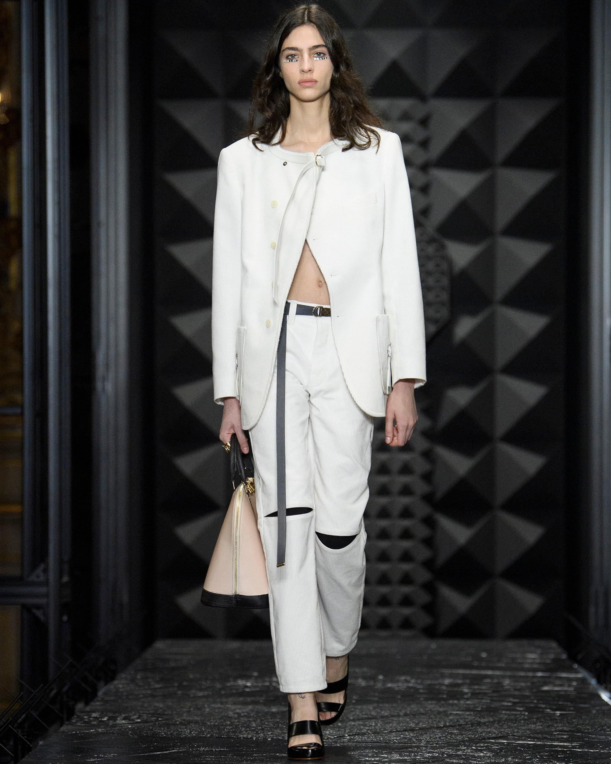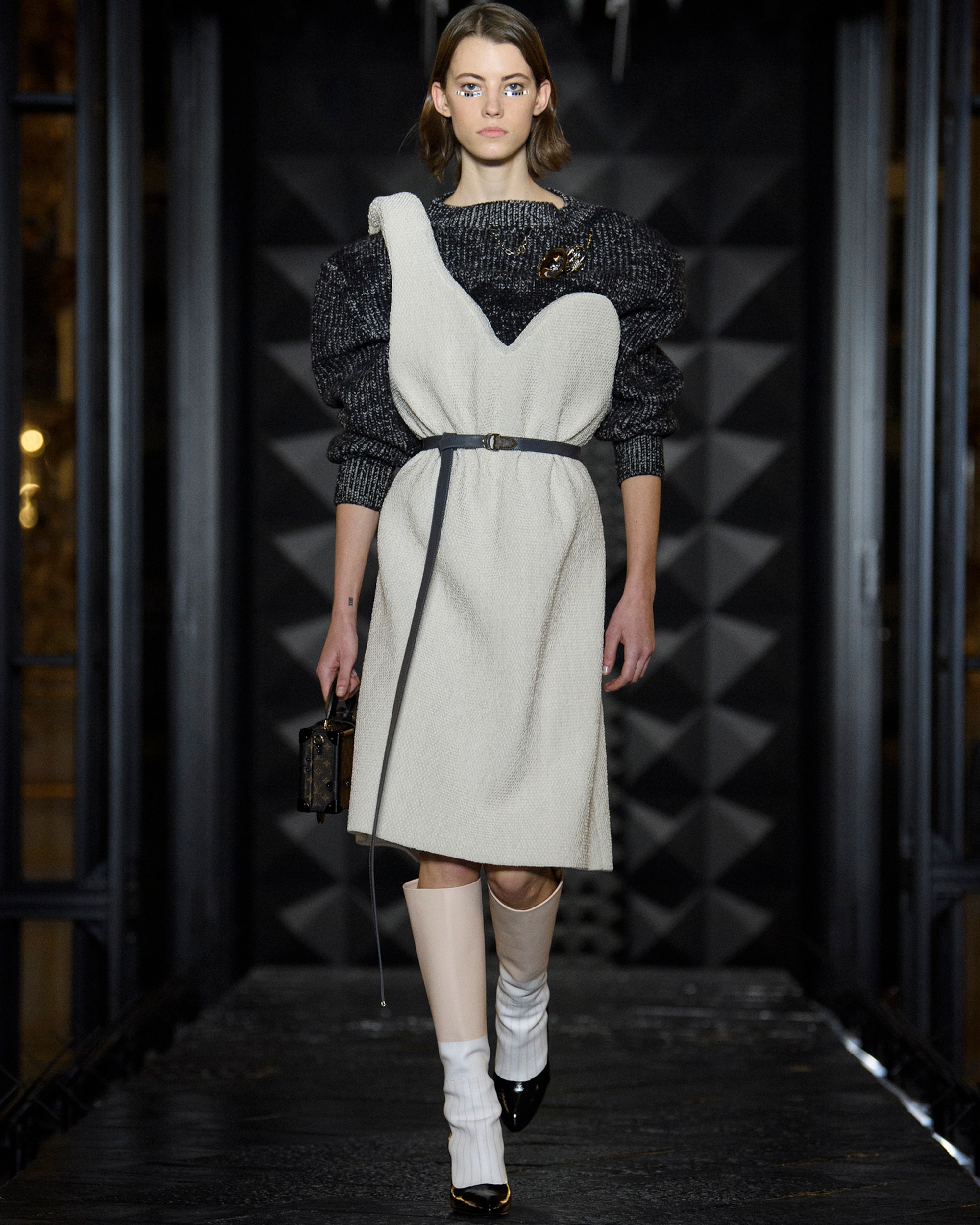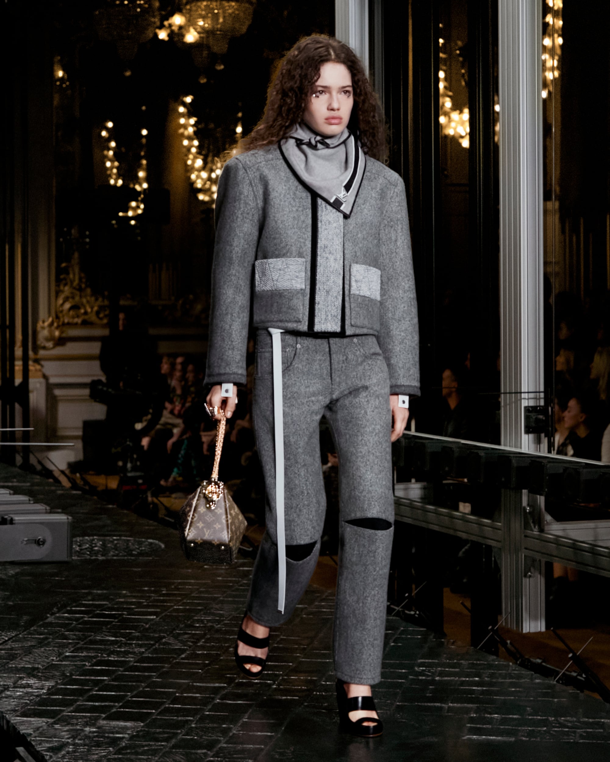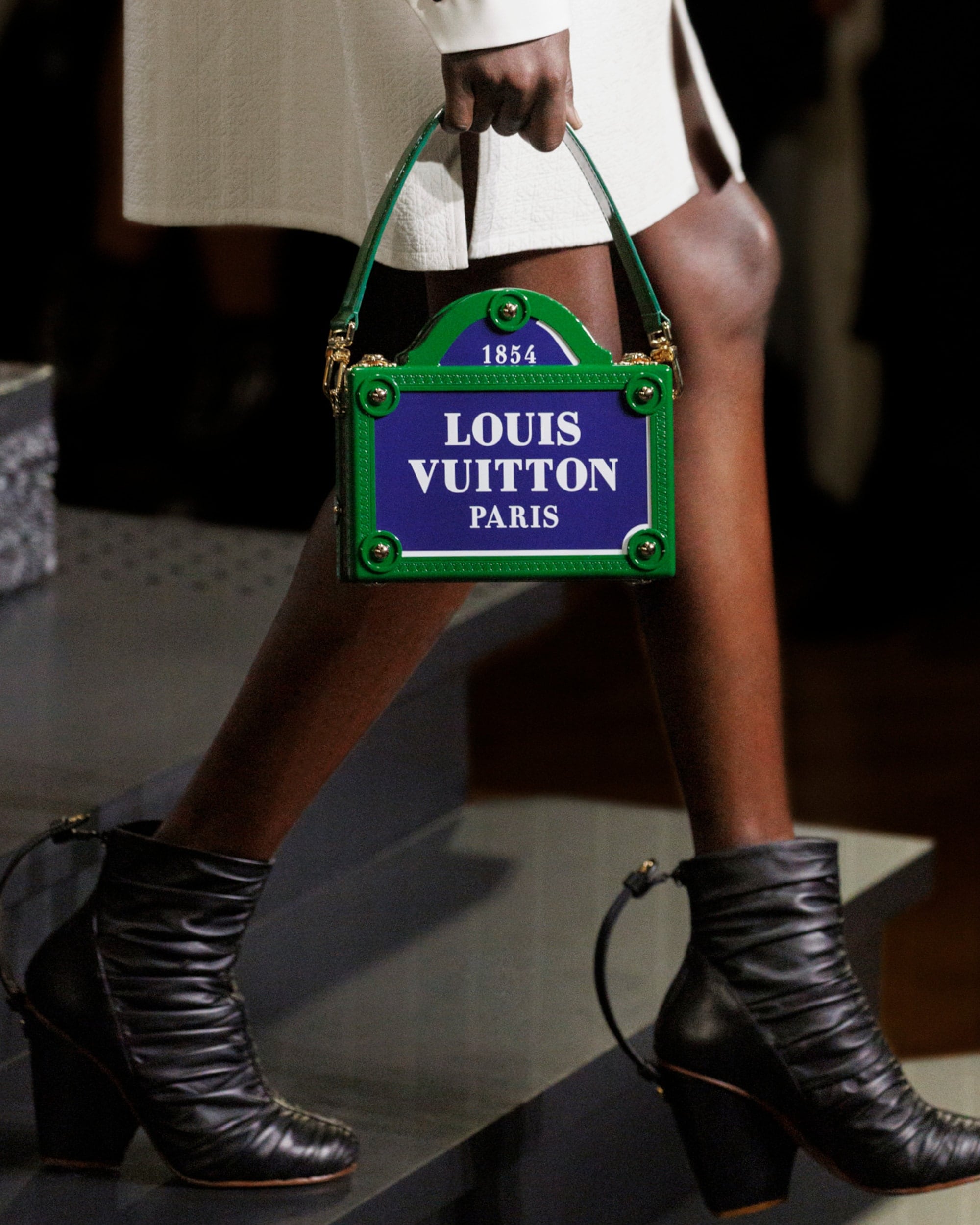 Die Damen Herbst Winter 2023 Kollektion wurde im Musée d'Orsay präsentiert. Nicolas Ghesquière arbeitete mit dem renommierten französischen Künstler Philippe Parreno und dem Sounddesigner Nicolas Becker zusammen, um ein immersives Bühnenbild zu entwerfen. Mit geometrischen Linien, einer Pariser Straße und einem kuratierten Klangerlebnis erweckte das Design Paris zum Leben. Live verstärkte Klänge des Herzschlags und der Schritte der Models wurden mit den Geräuschen der Stadt vermischt, wodurch ein Dialog zwischen der Fashion Show und ihrer Umgebung entstand.