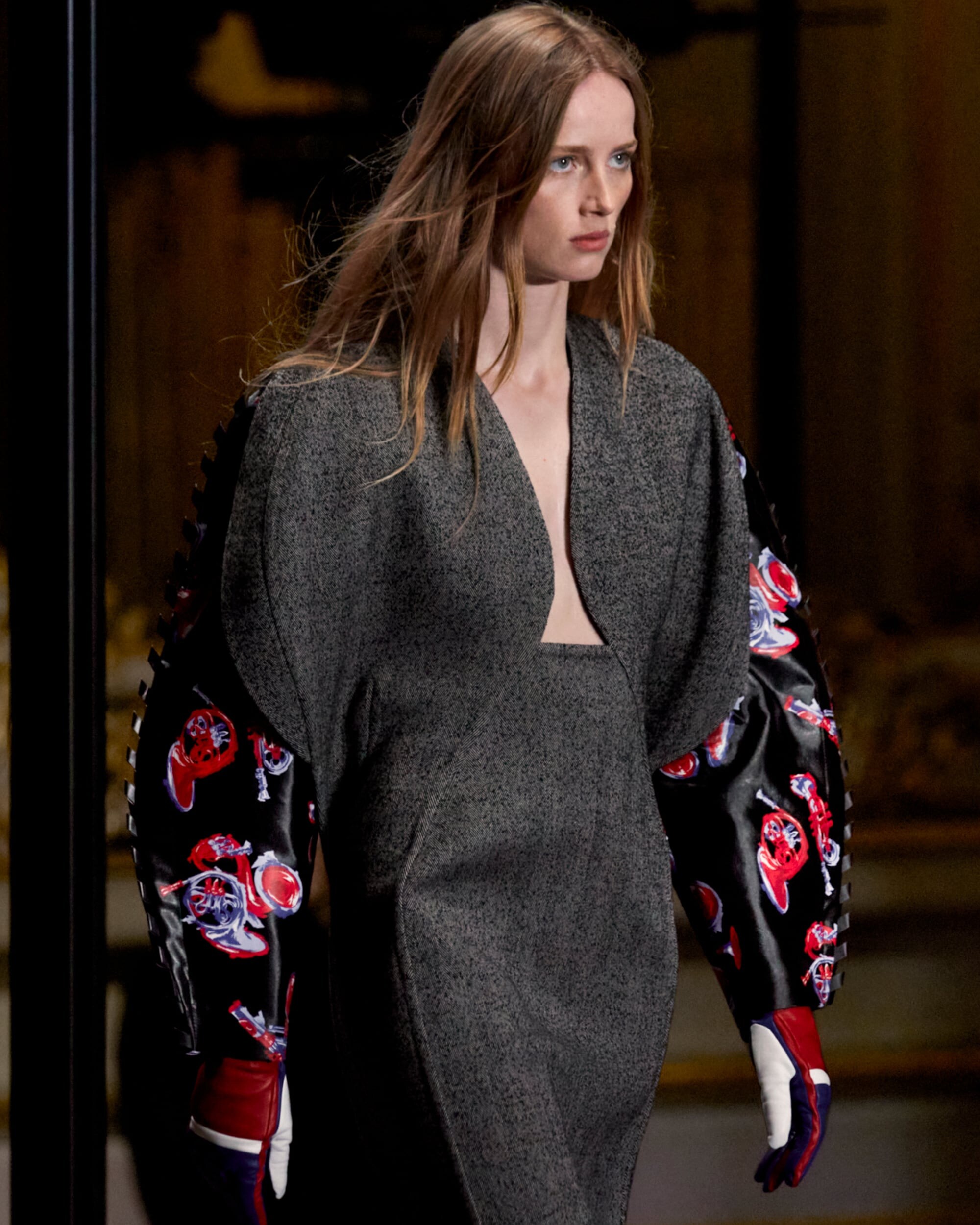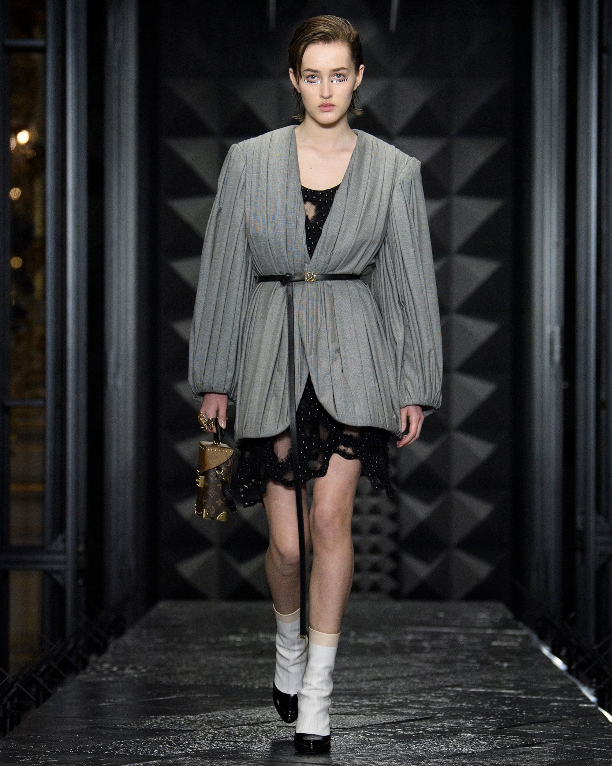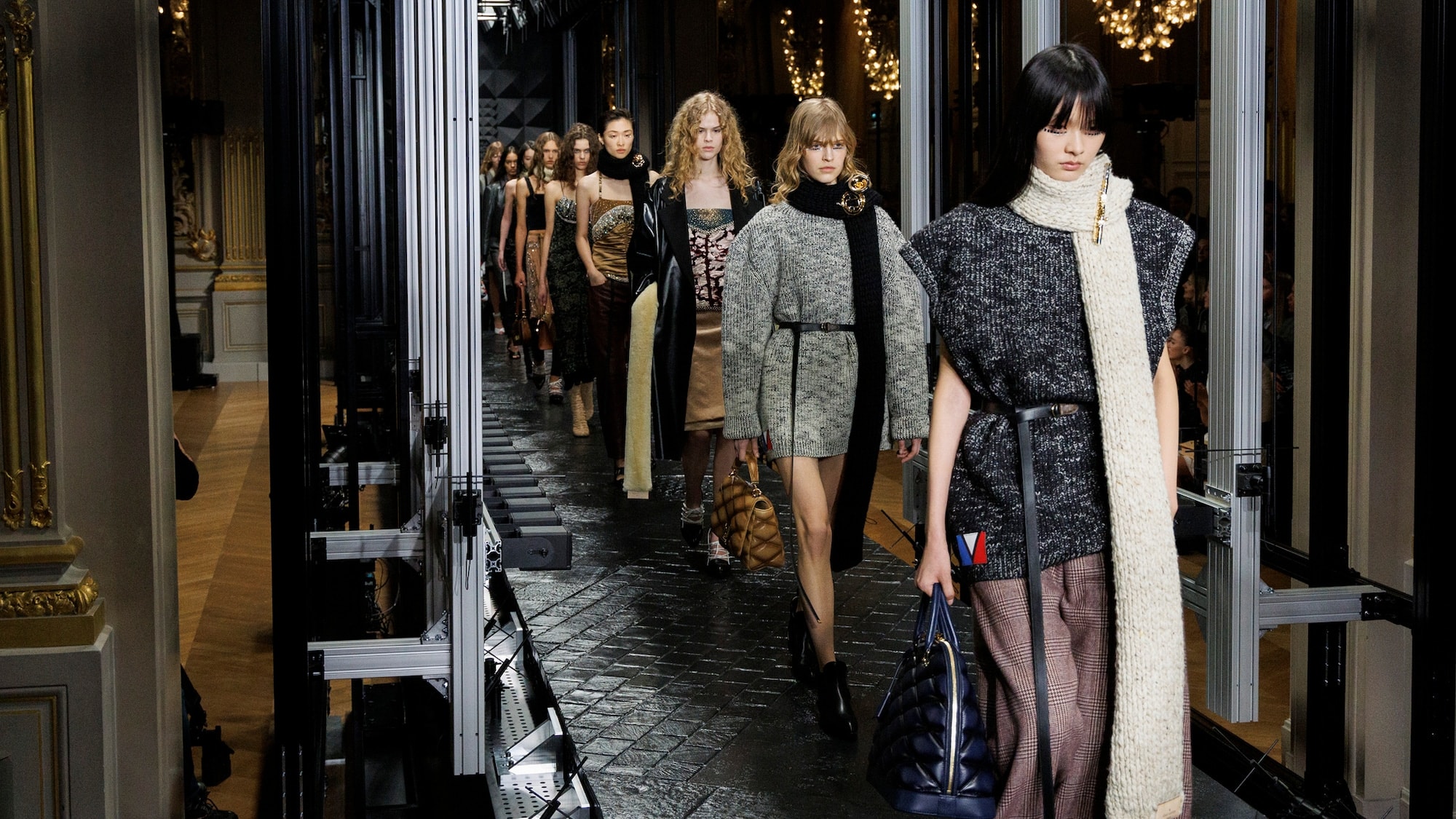 Die Damen Herbst Winter 2023 Kollektion wurde im Musée d'Orsay präsentiert. Nicolas Ghesquière arbeitete mit dem renommierten französischen Künstler Philippe Parreno und dem Sounddesigner Nicolas Becker zusammen, um ein immersives Bühnenbild zu entwerfen. Mit geometrischen Linien, einer Pariser Straße und einem kuratierten Klangerlebnis erweckte das Design Paris zum Leben. Live verstärkte Klänge des Herzschlags und der Schritte der Models wurden mit den Geräuschen der Stadt vermischt, wodurch ein Dialog zwischen der Fashion Show und ihrer Umgebung entstand.