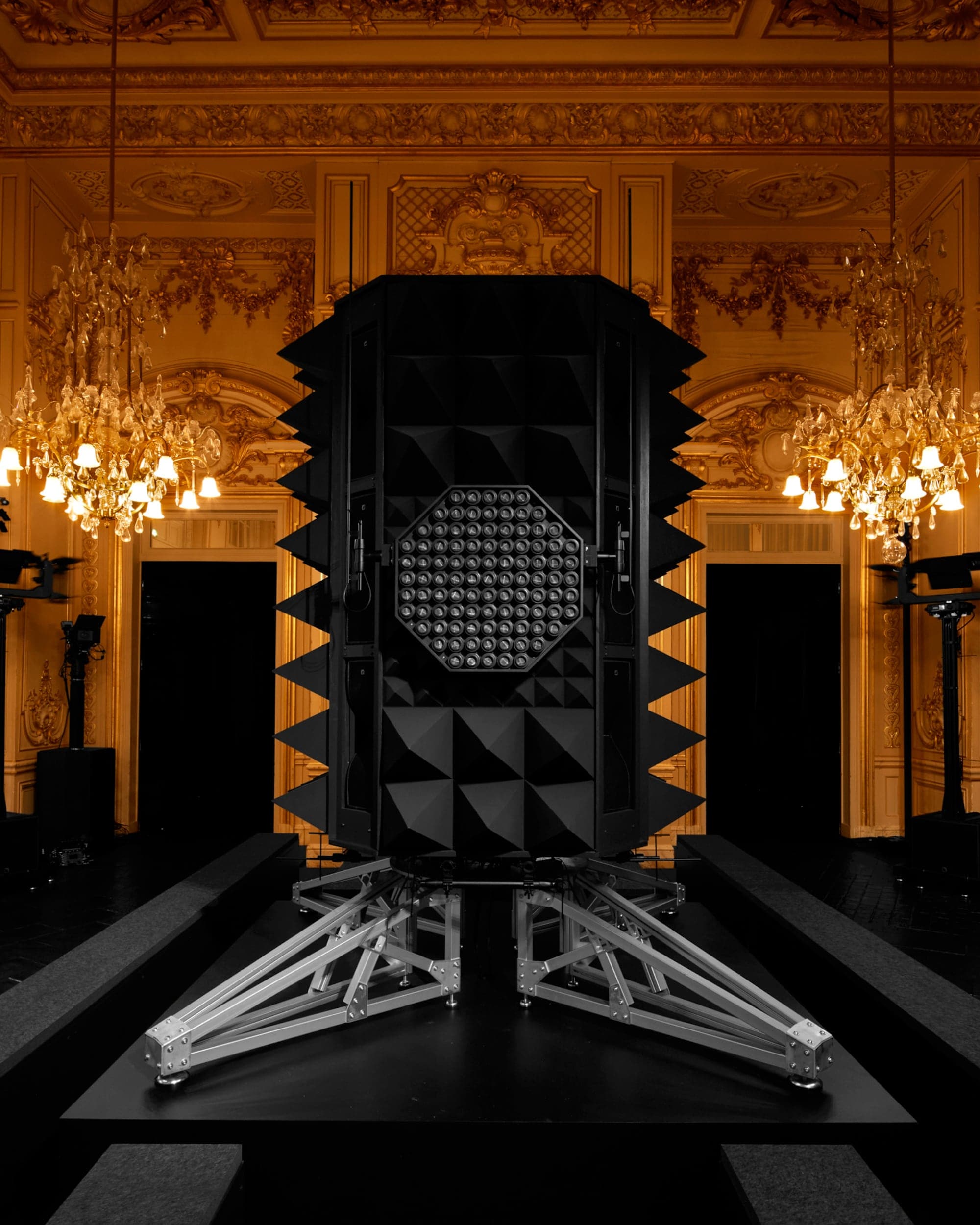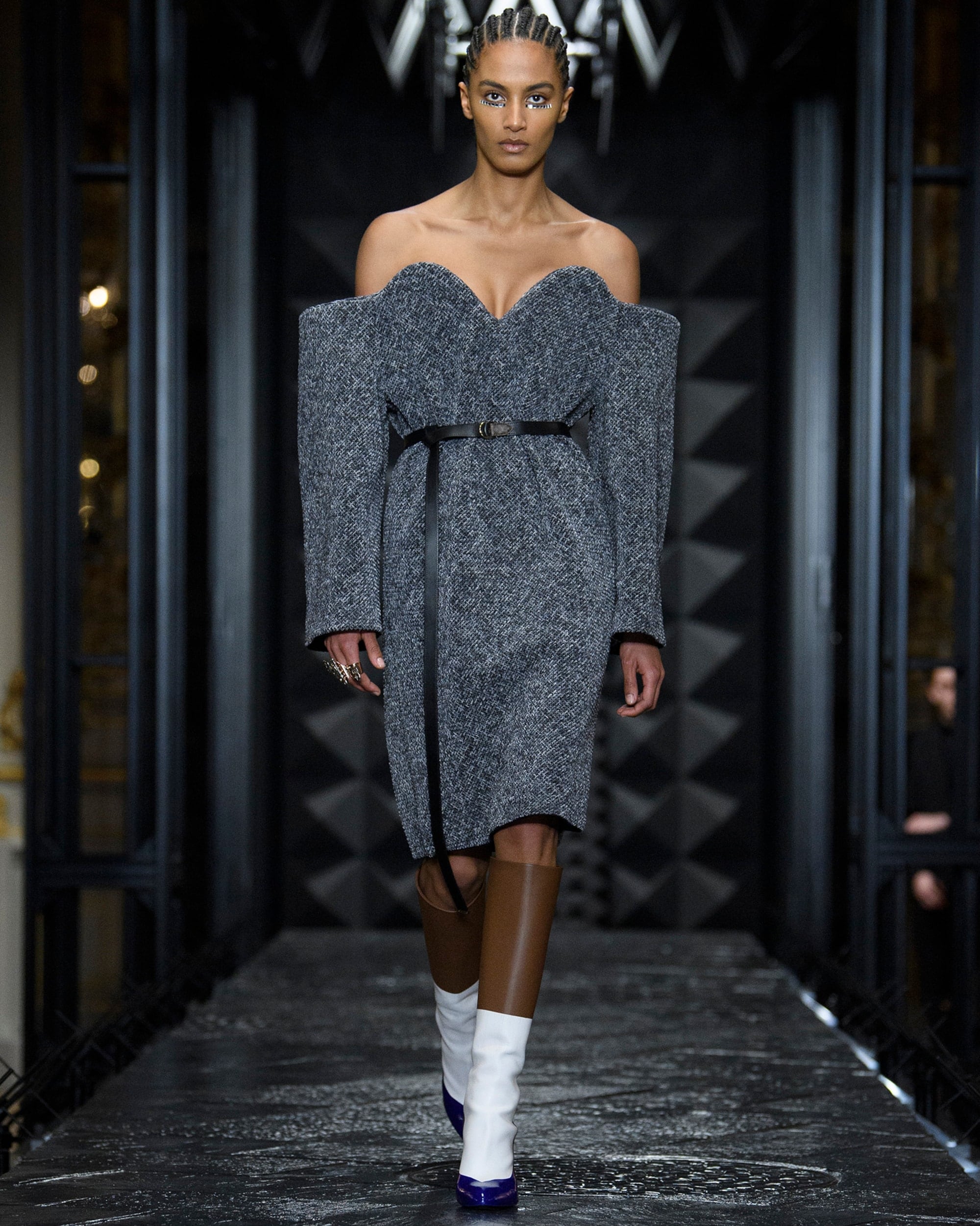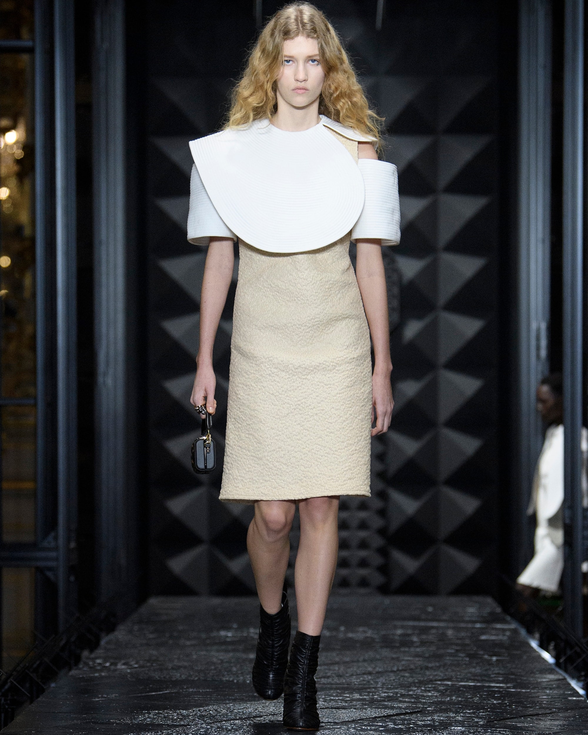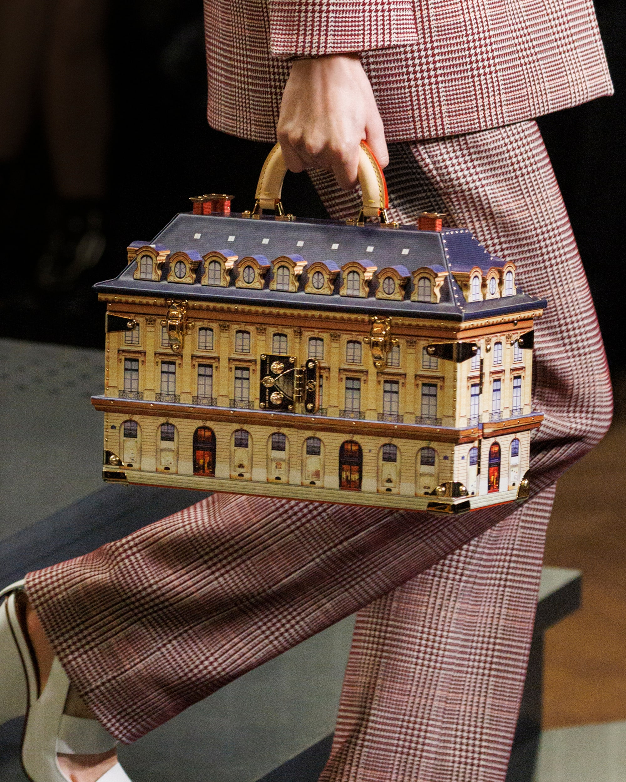 Die Damen Herbst Winter 2023 Kollektion wurde im Musée d'Orsay präsentiert. Nicolas Ghesquière arbeitete mit dem renommierten französischen Künstler Philippe Parreno und dem Sounddesigner Nicolas Becker zusammen, um ein immersives Bühnenbild zu entwerfen. Mit geometrischen Linien, einer Pariser Straße und einem kuratierten Klangerlebnis erweckte das Design Paris zum Leben. Live verstärkte Klänge des Herzschlags und der Schritte der Models wurden mit den Geräuschen der Stadt vermischt, wodurch ein Dialog zwischen der Fashion Show und ihrer Umgebung entstand.