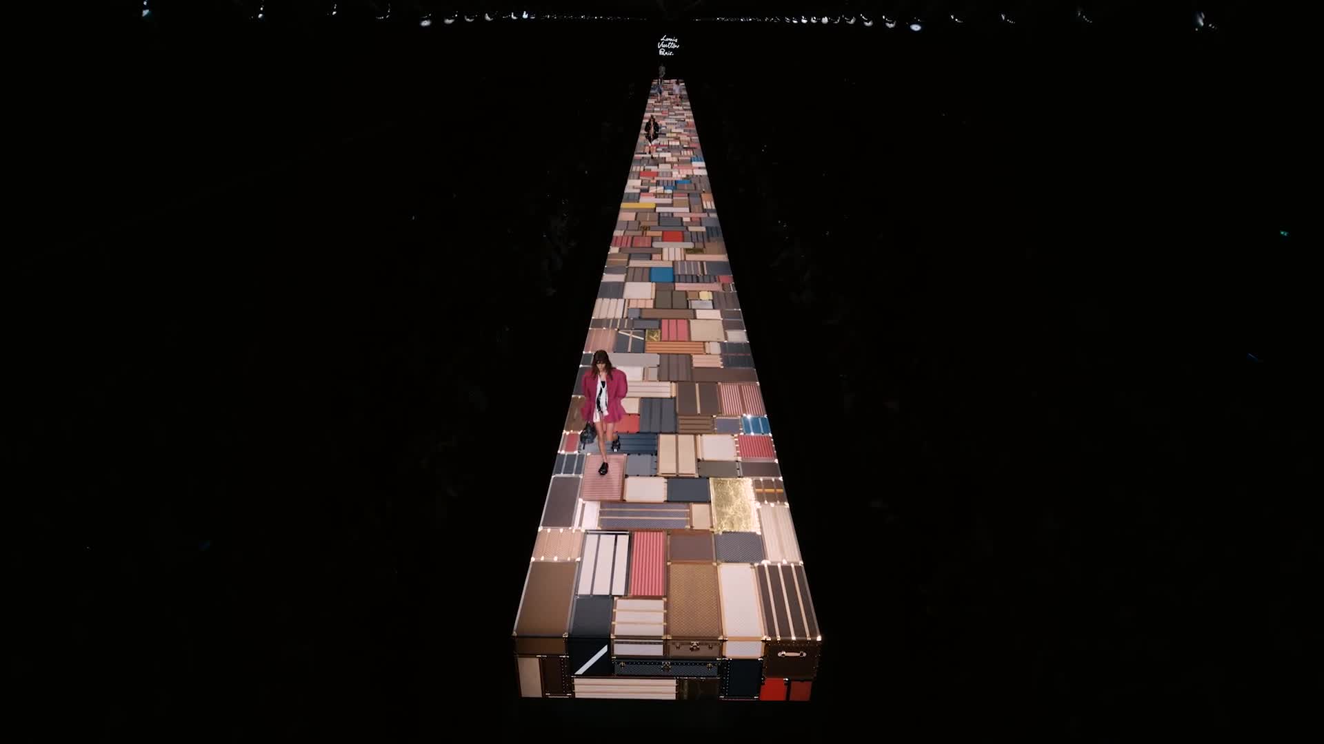 Der Laufsteg der Show von Nicolas Ghesquière ist eine Plattform aus über tausend verschiedenen Trunks als Hommage an die Geschichte der Maison und steht an der Spitze einer immersiven Spiegelkonstruktion - eine Anlehnung an die majestätische Architektur des Cour Carrée du Louvre in Paris.