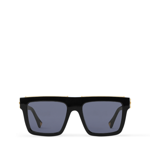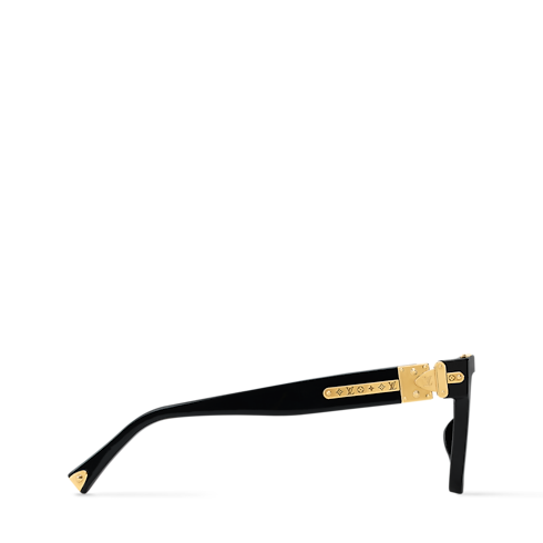 Die in Italien aus glänzendem Azetat gefertigte 1.0 Millionaires Sonnenbrille präsentiert sich in der aktuellen Saison als großes, rechteckiges Modell. Dabei trifft ein eleganter schwarzer Rahmen auf eine Silhouette im Downtown-Stil. Auf der Höhe der Augenbrauen zeigt sich ein goldfarbener Steg, während die Bügel und die S-Schlösser mit Scharnieren durch ein eingraviertes Monogram-Motiv akzentuiert sind, das an die Beschläge eines Koffers erinnert.