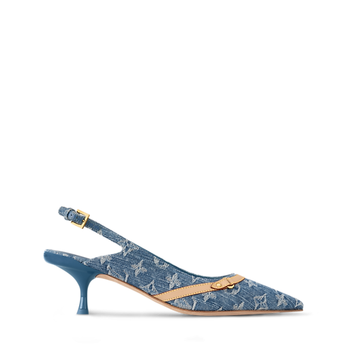 Der 6AM Slingback Pumps in Monogram Denim ist ein stilvolles, feminines Modell mit einer nach vorne spitz zulaufenden Zehenkappe und einem Kittenabsatz. Die Oberseite des Schuhs schmückt ein dekorativer Riemen aus naturbelassenem Rindsleder, der mit einer kleinen, gravierten Niete akzentuiert ist. Der Fersenriemen lässt sich mit einer modischen Schließe aus goldfarbenem Metall verstellen.