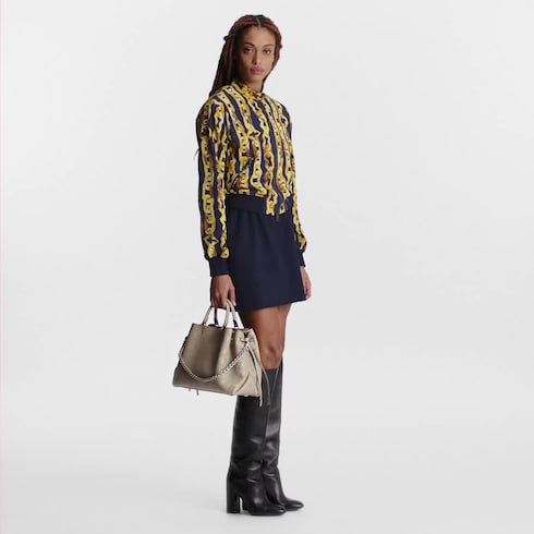 Die Bella Tote greift geschmeidiges Mahina Kalbsleder in subtilem, elegantem grauem Galet auf. Während das Leder einen zart drapierten Faltenwurf aufweist, rundet eine juwelenartige Kette das Ganze ab. Das Modell kombiniert die klassische Beuteltasche mit dem Design einer Carryall, wodurch sich dieses stilvolle Accessoire ideal für den Alltag eignet.