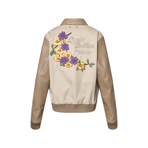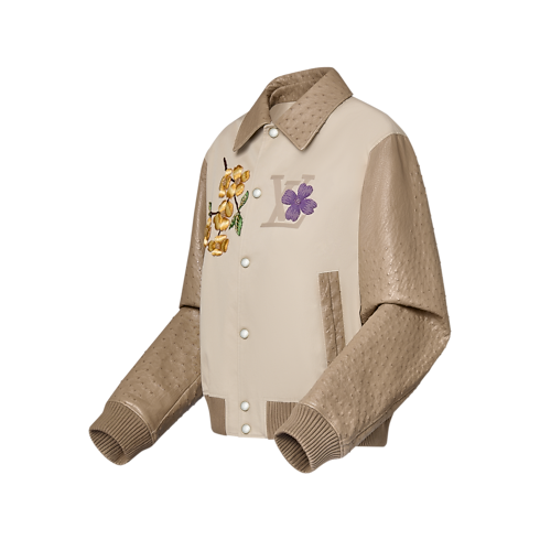 Diese exklusive Varsity Jacke in stilvollen Beigetönen zeigt das einzigartige Savoir Faire des Hauses Louis Vuitton. Während ihre Ärmel aus Straußenleder gearbeitet sind, ziert den Rumpf aus einem leichten Baumwoll-Twill ein von der Couture inspiriertes florales Motiv. Dieses kreiert durch schimmerndes Garn und Perlen einen Relief-Effekt. Das auffällige Modell bringt eine unverkennbare Note in Looks für den Tag wie für den Abend.