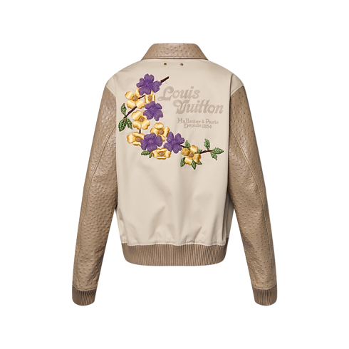 Diese exklusive Varsity Jacke in stilvollen Beigetönen zeigt das einzigartige Savoir Faire des Hauses Louis Vuitton. Während ihre Ärmel aus Straußenleder gearbeitet sind, ziert den Rumpf aus einem leichten Baumwoll-Twill ein von der Couture inspiriertes florales Motiv. Dieses kreiert durch schimmerndes Garn und Perlen einen Relief-Effekt. Das auffällige Modell bringt eine unverkennbare Note in Looks für den Tag wie für den Abend.