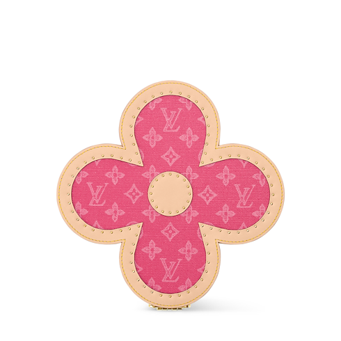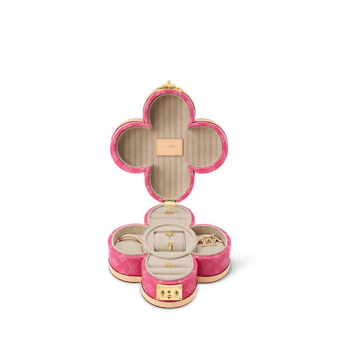 Das Blooming Box Schmuckkästchen ist in Monogram Origine Canvas gefertigt, dem neuen Monogram-Motiv des Hauses, das von einem Koffer aus dem Jahr 1902 inspiriert wurde. Das Modell präsentiert sich in Form einer Monogram-Blüte in einer frischen pinkfarbenen Ausführung. Es verfügt über ein goldenes S-Schloss und ist mit naturbelassenem Rindsleder besetzt. Das Innere zeigt sich mit einem Innenfutter aus Leder und gestreiftem Textil. Die Fächer sind speziell für Armbänder, Ringe, Ohrringe und weitere Accessoires gedacht.