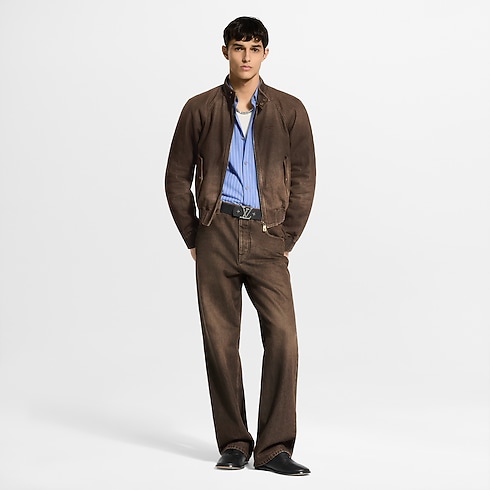 Der ikonische Coffee Indigo Denim der Saison präsentiert sich hier in Form eines legeren, aber zugleich eleganten Blousons mit Reißverschluss. Altgoldfarbene Druckknöpfe und ein charakteristischer Patch aus natürlich gegerbtem Rindsleder erinnern an das Erbe des Hauses Louis Vuitton als Kofferhersteller, während eine dezente Louis Vuitton Paris Stickerei die Brust ziert. Ein gewaschener Vintage-Look, ergänzt durch einen gerippten Bund und gerippte Bündchen, vollendet dieses vielseitige Modell für jeden Tag.