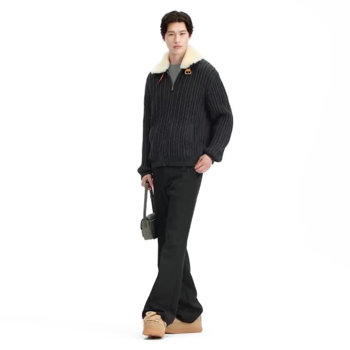 Dieser dunkelgraue Blouson mit Reißverschluss präsentiert sich in einem markanten, gerippten Strick aus hochwertigem Kaschmir-Woll-Gemisch mit offener Struktur. Der kuschelige Kragen aus Schaffell lässt sich mit einem Riemen aus natürlich gegerbtem Leder sicher verschließen und ist mit einem Marque L. Vuitton Déposée Patch aus demselben Leder veredelt. Dieses elegante und zugleich lässige Modell ist die perfekte Wahl für die Wintersaison.