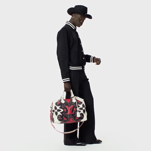 Ein mit Kristallen besetzter Patch aus Leder in Form der Monogram-Blüte und ein funkelnder Aufnäher auf der Rückseite mit der „Marque L. Vuitton Déposée“ Signatur setzen an dieser stilsicheren Bomberjacke aus schwarzem Wildleder unverkennbare Akzente. Der schwarz-weiß gestreifte Rippstrick am Kragen und an den Säumen kreiert eine sportive Note, während die Druckknöpfe mit Perlmutt-Finish die Raffinesse dieses zeitgemäßen Entwurfs betonen.