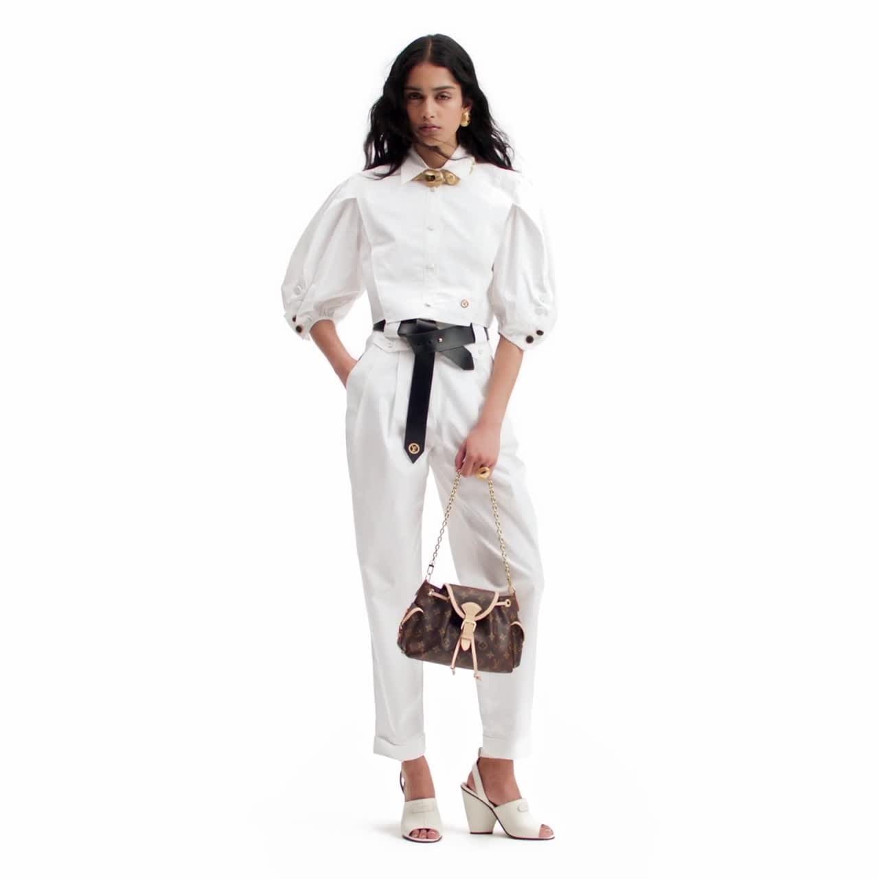 Diese Bluse aus Baumwollpopeline setzt ein romantisches Statement. Sie präsentiert sich mit einer kurzen Silhouette und voluminösen, bis zu den Ellbogen reichenden Puffärmeln. Ein spitzer Kragen sowie akkurate Falten von der Schulter bis hinunter zum Saum verleihen ihr einen eleganten Look. Eine LV Circle Signatur sowie die stilvollen, bestickten Knöpfe dieser Saison runden das Modell ab.