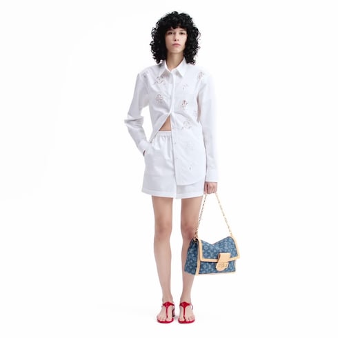 Diese Boxershorts in einer legeren, geraden Passform spiegeln einen klassischen Look der Herrenkollektion wider. Der Entwurf aus griffiger Baumwolle verfügt über einen komfortablen, elastischen Taillenbund, zwei kleine Knöpfe mit Perlmutt-Finish und ein Detail im Stil eines Hosenschlitzes. Das linke Bein ist auf subtile Weise mit einer romantischen Interpretation der LV Initialen als zarte Lochstickerei akzentuiert.