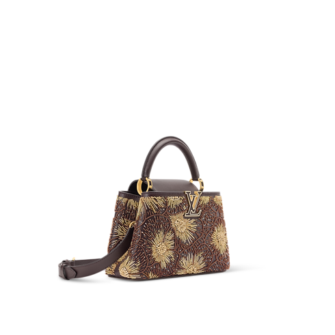 Diese auffällige LV Mirage Version der Capucines BB entstammt der Exceptionals Kollektion. Das aus Kalbsleder gearbeitete Modell setzt am Abend ein Statement. Schimmernde Perlen und eine Stickerei ergänzen die goldfarbenen Beschläge sowie die Ton in Ton gehaltenen LV Initialen. Die vielseitige Tasche lässt sich wahlweise mit der Klappe innen oder außen tragen und besitzt die perfekte Größe für alles Wesentliche, einschließlich des bevorzugten Lippenstifts.
