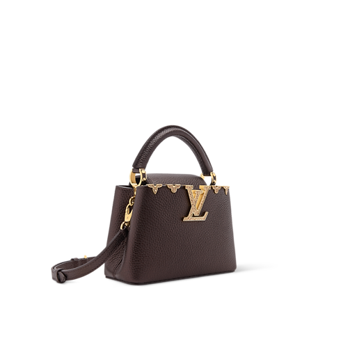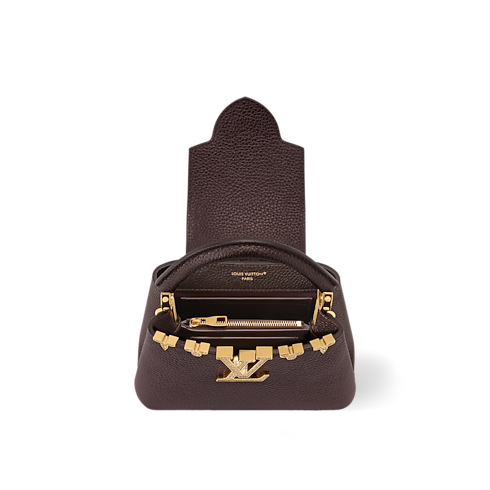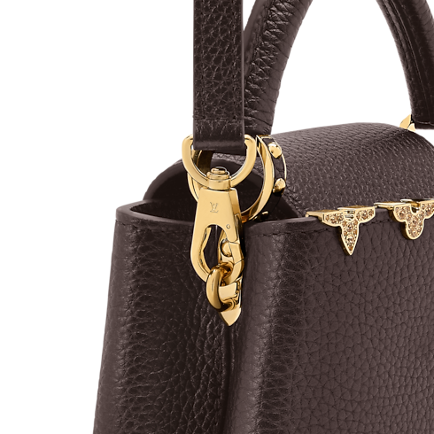 Diese elegante Version der Capucines Mini in Datewood zählt zu der LV Mirage Kollektion. Das Modell in Taurillon Leder stellt die exquisite Handwerkskunst des Hauses Louis Vuitton unter Beweis. Die Tasche ist mit charmanten Flower Crown-Details entlang der Oberkante verziert, welche perfekt auf die LV Initialen abgestimmt sind. Das auf zwei Arten tragbare Design ist eine stilvolle Wahl für den Tag wie für den Abend und lässt sich auf vielfältige Weise kombinieren.