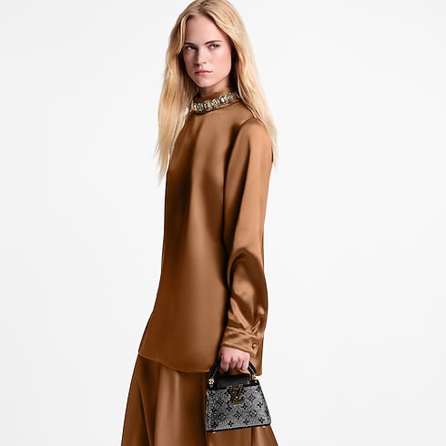 Ein Bestandteil der Exceptionals Kollektion ist diese LV Mirage Version der Capucines Nano Handtasche - eine elegante Wahl für abendliche Soirées. Das aufwendig gefertigte Modell aus Satin ist mit Besätzen in Taurillon Leder versehen. Es interpretiert die ikonische Monogram-Blüte durch schimmernden Swarovski™ Kristall-Strass neu und wird von schwarzen sowie goldfarbenen LV Initialen geziert. Das vielseitige Accessoire bietet verschiedene Tragemöglichkeiten und offenbart in seinem Inneren ein flaches Fach sowie einen Spiegel.