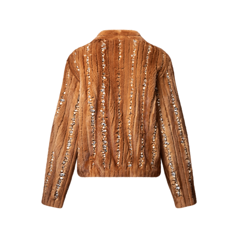 Dank hochwertigem Pelz und glitzernden Applikationen verströmt dieser exklusive Cardigan vom Laufsteg der Frühjahr Sommer 2025 Fashion Show eine raffinierte Dandy-Note. Zugleich ziert eine mit Kristallen besetzte LV Brosche die linke Brust. Abgerundet wird das auf Bestellung erhältliche Design durch in unregelmäßigen Linien und detailgenau von Hand gestickte Juwelen.
