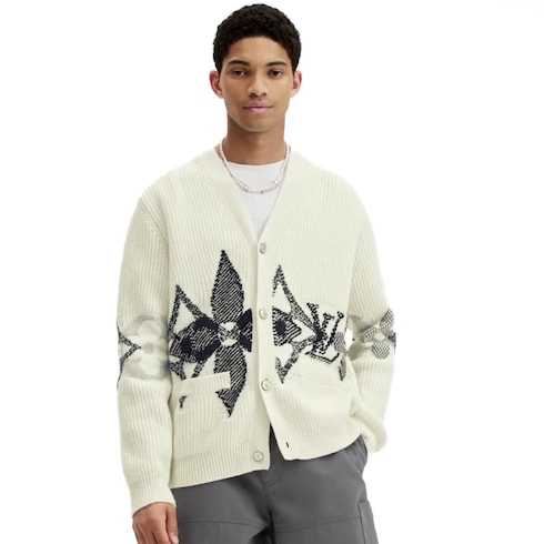 Dieser winterliche Cardigan aus Wolle präsentiert ein grafisches Motiv über dem unteren Rumpf und an den Ärmeln mit großen, sich teilweise überschneidenden LV Signaturen und Monogram-Blüten, die an Schneeflocken erinnern. Der raffinierte Intarsien-Strick zeigt Nähte in Grau- und Blautönen, die einen unverkennbaren Kontrast zum weißen Grobstrick setzen. Ideal für gemütliche Abende im Hotel nach einem Tag auf der Skipiste.