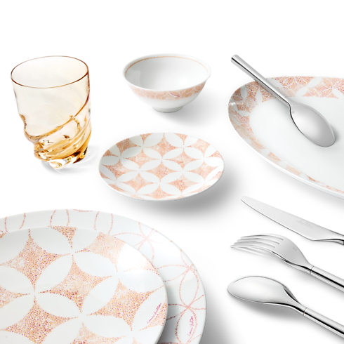 Die perfekte Ergänzung zu den weiteren Kreationen derselben Serie: Die wunderschöne und funktionale Constellation ovale Servierplatte macht das Servieren am Tisch zu einem eleganten Erlebnis. Ihr grafisches Muster interpretiert ein historisches Emblem des Hauses Louis Vuitton, das Motiv aus Monogram-Blüte und Diamant, in einem anmutigen Geflecht ineinander verschlungener Linien neu. Gefertigt aus feinstem, besonders weißem Porzellan, verkörpert diese zart gearbeitete Platte die Kunst des stilvollen Lebens im Sinne der Maison.