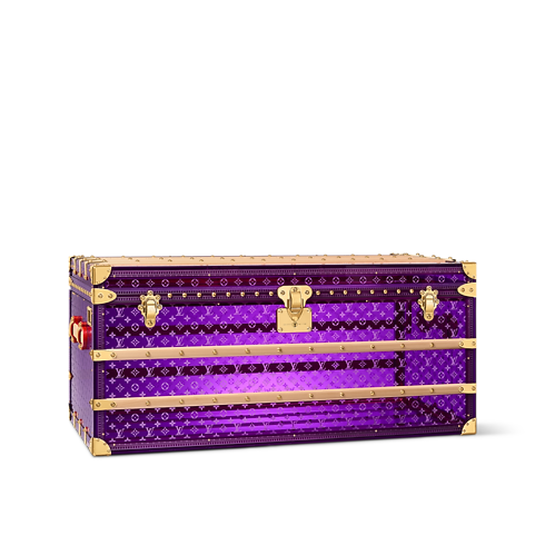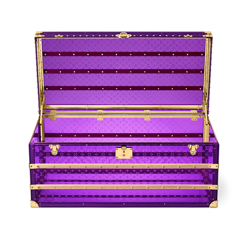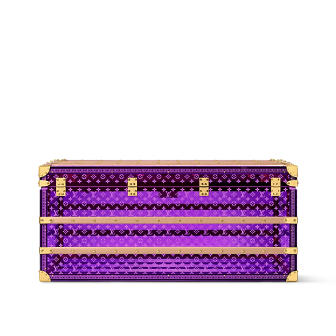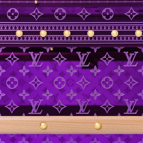 Ein Ausdruck des Bestrebens von Pharrell Williams, die Grenzen der Innovation zu erweitern: Dieser durchsichtige Courrier Losine 110 ist aus violettem Acrylglas gefertigt, das mit dem Monogram-Motiv graviert ist. Der intensive Farbton, der in Indien für Kraft und Spiritualität steht, macht diesen Koffer höchst faszinierend. Das mit goldfarbenen Beschlägen aus Metall und Leisten aus Holz abgerundete Modell ist ein Statement modischer Kunstfertigkeit.
