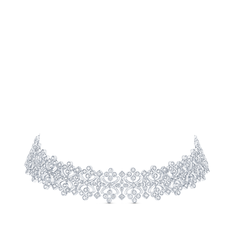 Als außergewöhnliches Beispiel für die Kunst der Schmuckherstellung ist die Dentelle Masterpiece Halskette aus 18 Kt Weißgold gefertigt und mit glamourösen Diamanten besetzt. Das durchbrochene Design zeichnet sich durch Motive mit Monogram-Blüten in einem aufwendigen Flechtwerk aus, das der feinsten Couture-Spitze in nichts nachsteht. Genau wie die gleichnamige Spitze gibt dieses Schmuckstück dezent den Blick auf die Haut frei und kreiert auf diese Weise einen vorteilhaften, femininen Look.