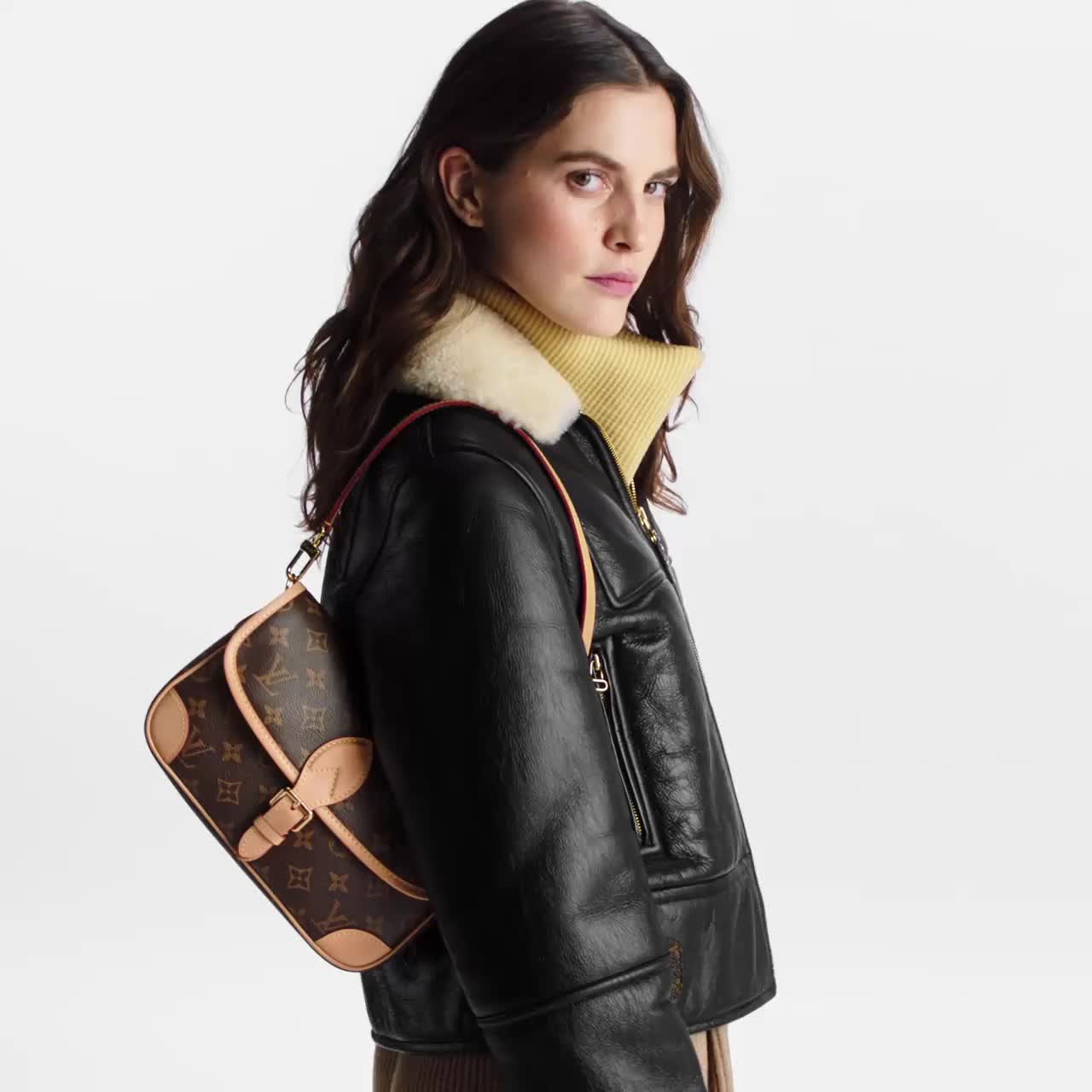 Die Diane Handtasche in Monogram Canvas mit einem Tragegriff im Stil eines Ranzens interpretiert ein ikonisches Modell aus den Neunzigerjahren neu. Sie kombiniert Vintage-Details wie Ecken aus Leder und eine von den Archiven inspirierte Schließe mit der zeitgemäßen Funktionalität eines wohldurchdachten Inneren. Ihr exklusiver breiter Schulterriemen aus Jacquardgewebe ist wendbar. Er präsentiert sich auf einer Seite mit einer auffallenden Louis Vuitton Signatur und auf der anderen Seite mit dezenten Monogram-Blüten.