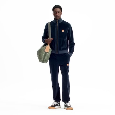 Diese legere Trainingshose erhält durch mitternachtsblauen Samt eine elegante Note. Die Taschen sind mit Ton in Ton gehaltenem Cord versehen, während Enden mit Perlmutt-Finish dem Zugband an der Taille einen dandyhaften Akzent verleihen. Ein stilvoller Patch aus natürlich gegerbtem Leder mit der „Marque L. Vuitton Déposée“ Signatur ziert das linke Bein. Mit der dazu passenden Trainingsjacke entsteht ein stilvolles und zugleich entspanntes Ensemble.