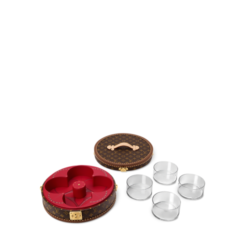 Inspiriert von asiatischen Bonbondosen, präsentiert sich die Festivity Box aus Monogram Canvas mit Beschlägen aus goldfarbenem Metall und einem soliden Tragegriff aus Leder. Im Inneren offenbart sie vier herausnehmbare Behälter aus Glas, welche ideal für Nüsse, Süßigkeiten oder andere Köstlichkeiten sind, eingebettet in ein leuchtend rotfarbenes Futter. Dieses Modell ist mehr als nur eine Box, sie ist eine Einladung, unvergesslich freudige Momente gemeinsam zu erleben.