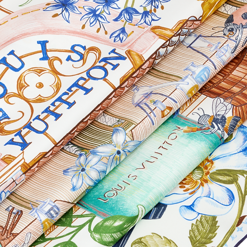Das vollständig aus Seide gefertigte Fontaines Parfumées Carré fängt die Essenz des Hauses Louis Vuitton in einem aufwendigen Motiv ein, das von der Kunst der Düfte inspiriert ist. Das farbenfrohe Motiv zeigt einen Parfum-Extraktor im Vintage-Stil, umgeben von zarten Blumen, vor dem Parfum-Atelier des Hauses Louis Vuitton. Ein elegantes, feminines Accessoire, das die Harmonie von Handwerkskunst und Natur verkörpert.