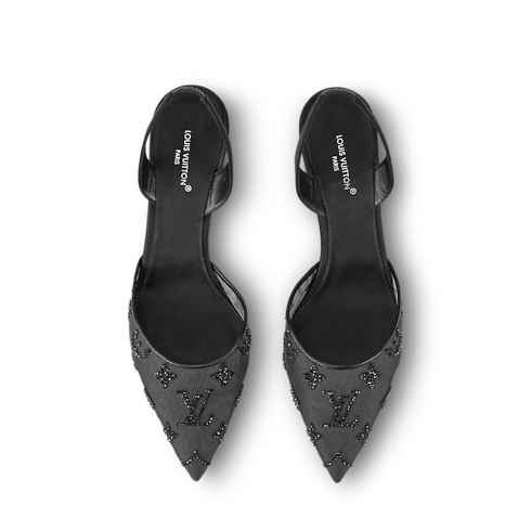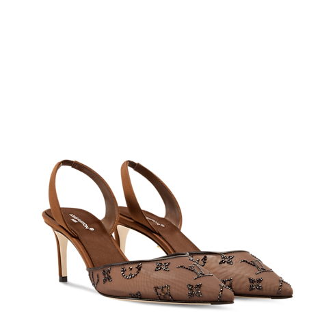 Durchscheinendes Netzgewebe und Swarovski™-Kristalle vereinen sich auf dem Gala Slingback Pumps zu einem glamourösen Design. Das transparente Netzgewebe gibt den Blick auf den Fuß frei, während die funkelnden Strasssteine das Monogram-Motiv des Hauses Louis Vuitton in schimmernder Ausführung präsentieren. Eine nach vorne spitz zulaufende Zehenkappe sowie ein schlanker, mittelhoher Absatz vollenden dieses Modell, das eine elegante und dennoch angenehme Wahl für den Abend ist.