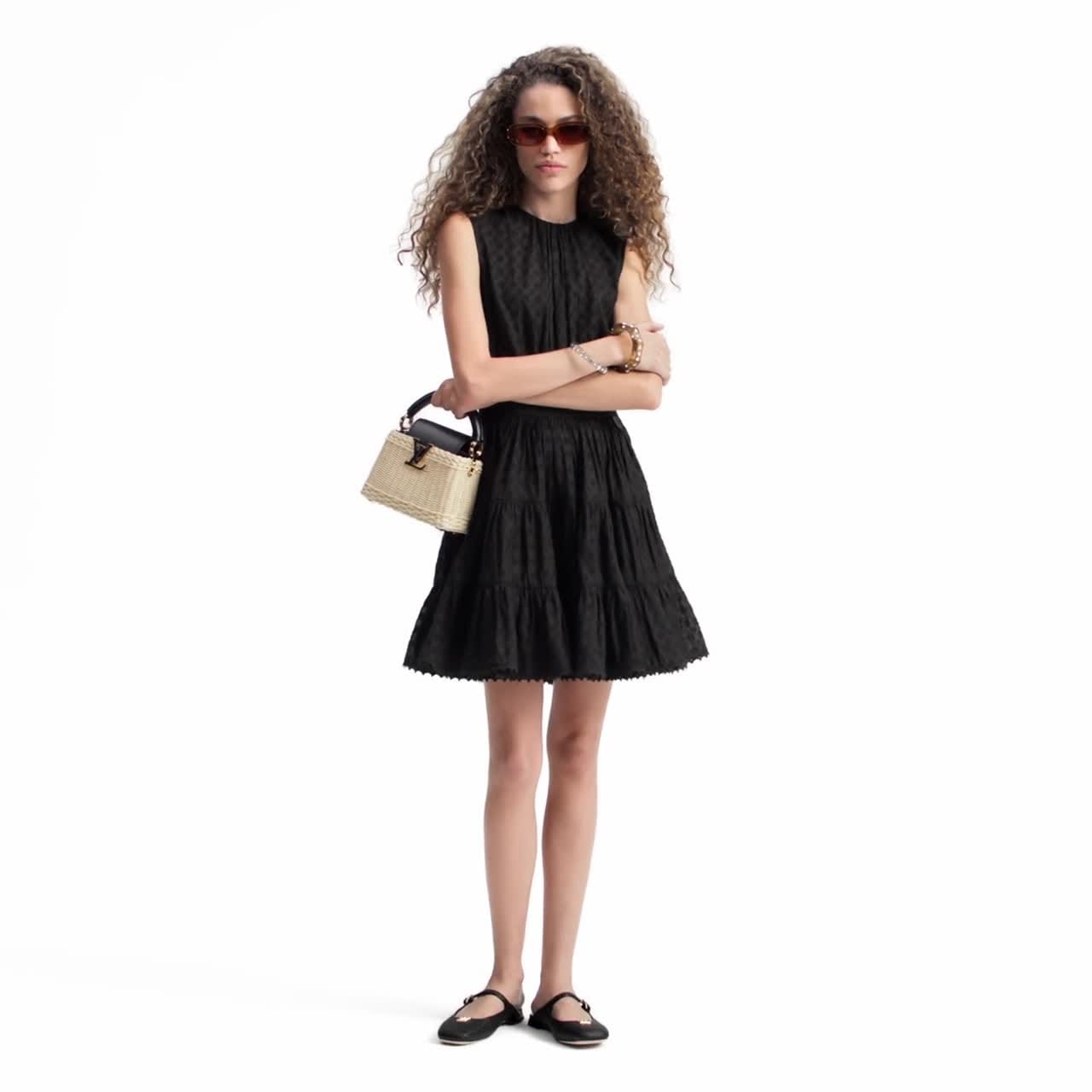 Dieses klassische kleine Schwarze ist aus einem luftigen Baumwoll-Seidengemisch gefertigt, das durchgängig mit dem Monogram-Motiv in Fil Coupé versehen ist. Am Saum setzt ein Besatz mit Monogram-Blüten einen zusätzlichen Akzent. Das figurnah geschnittene Oberteil wird durch den voluminösen, A-linienförmigen Rock mit gerafften Stufen kontrastiert. Ein freiliegender, goldfarbener Reißverschluss verschließt das Kleid auf der Rückseite.