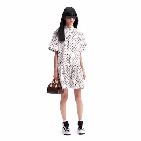 Dank eines grafischen, durchgängigen Monogram-Motivs in dem Pop-Art-Stil der Saison verströmt dieses Hemdkleid aus Baumwollpopeline eine auffallende, sommerliche Note. Gleichzeitig greift die obere Hälfte klassische Attribute der Maßkonfektion auf, wie etwa die kurzen Ärmel, ein eleganter Kragen und Knöpfe an der Vorderseite. Da der Rock entlang der Hüfte gerafft ist, kreiert er luftiges Volumen.