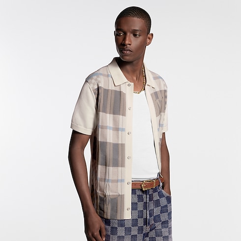 Dieses kurzärmlige Hemd aus einem feinen Baumwollstrick ist auf der Vorderseite mit einem Jacquard-Karomuster in den eleganten Beigetönen der Frühjahr Sommer 2026 Fashion Show versehen. In das Motiv sind dezente Signaturen integriert. Ein gestrickter Kragen im Stil eines Polohemds und Knöpfe mit Perlmutt-Finish machen aus dieser raffinierten Interpretation eines Modells für jeden Tag ein unverkennbares Statement.