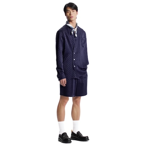 Dieses fließend fallende, langärmlige Hemd verweist auf die Herbst Winter 2025 Zusammenarbeit zwischen Pharrell und Nigo. Es präsentiert sich mit einem zeitgemäßen Verschluss im Kimono-Stil, der an die japanische Herkunft von Nigo erinnert. Der Entwurf ist aus einem seidigen Jacquardgewebe in intensivem Dunkelblau gefertigt. Für dekorative Akzente sorgen zudem ein Ton in Ton gehaltenes Dandy Monogram-Motiv und dezente Knöpfe mit Perlmutt-Finish. Ein Aufnäher mit Marque L. Vuitton Déposée Signatur ziert die Rückseite dieses Modells, das sowohl tagsüber als auch abends eine elegante Wahl ist.