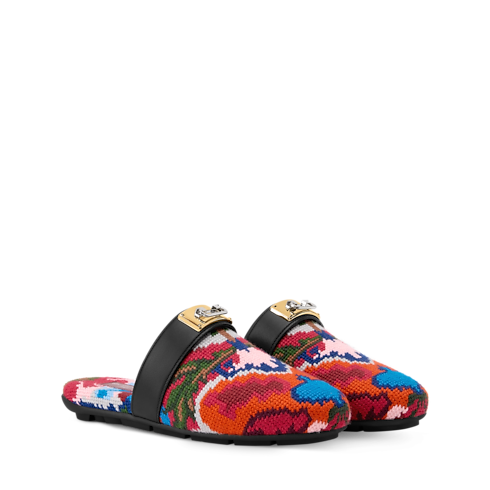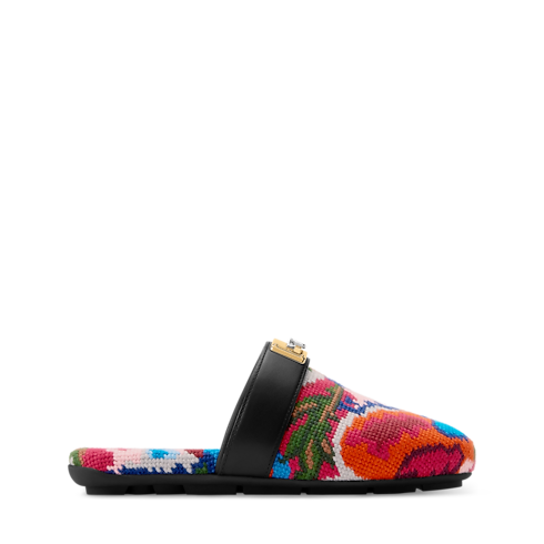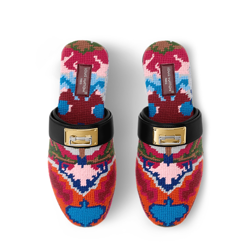 Auf dem Laufsteg der Frühjahr Sommer 2026 Fashion Show präsentierte sich die Haven Pantolette mit offener Ferse. Sie vereint Komfort und raffinierte Handwerkskunst. Der Schaft zeigt sich mit einem Tapisserie-Motiv im Vintage-Look, das an orientalische Teppiche und französische Stickereien des 19. Jahrhunderts erinnert. Ergänzt wird das Design durch einen Lederriemen, verziert mit einem goldfarbenen Swing Lock Detail, das von den Griffen der Louis Vuitton Koffer inspiriert ist.