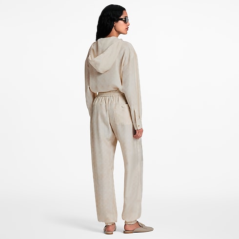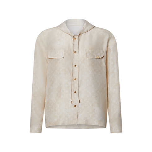 Dieses Hemd setzt mit seiner klaren, kantigen Silhouette, die durch eine legere Kapuze mit Zugband vollendet wird, ein elegantes Statement. Das aus fließender Seide gefertigte Modell präsentiert ein traumhaftes Monogram Cloud-Motiv in dezenten, saisonalen Nuancen, während goldfarbene Elemente aus Metall, einschließlich eines Monogram-Blüten-Details auf einer der beiden Pattentaschen, einen stilvollen Akzent setzen.