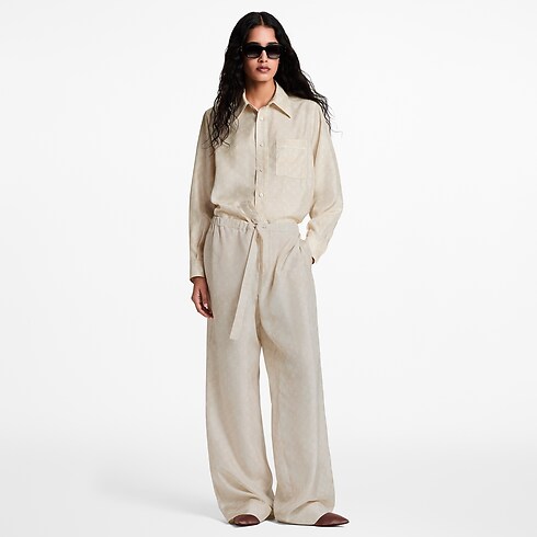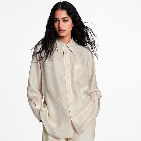 Dieses Hemd ist in einer großzügigen, maskulinen Form aus weicher, fließender Seide geschnitten, was ihm eine luftige Silhouette verleiht. Das Modell ist dezent mit einem Monogram Cloud-Motiv in einer subtilen saisonalen Farbgebung versehen, während ein spitzer Kragen, eine Knopfleiste und eine aufgesetzte Tasche auf zeitlose Maßkonfektion verweisen.