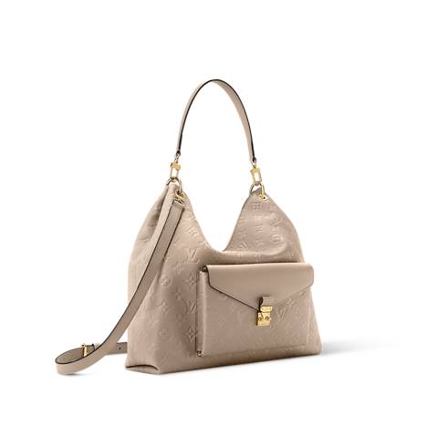 Diese Métis Beuteltasche in dem charakteristischen Monogram Empreinte Leder des Hauses Louis Vuitton ist eine zeitlose Wahl, die saisonale Trends überdauert. Die Tasche präsentiert sich in einer klassischen Farbgebung, die sich harmonisch zu den meisten Outfits kombinieren lässt. Sie ist mit eleganten, goldfarbenen Beschlägen wie einem ikonischen S-Schloss auf dem vorderen Fach versehen. Die geräumige Handtasche bietet Platz, um alles Wesentliche für jeden Tag zu verstauen, einschließlich eines Notizbuchs und E-Readers. Ihr abnehmbarer Griff erlaubt vielseitige Tragemöglichkeiten.