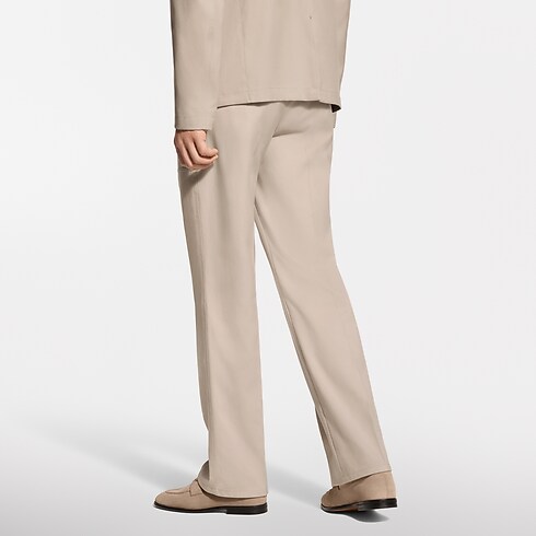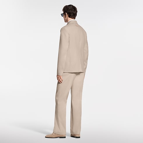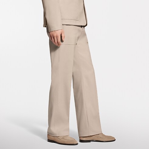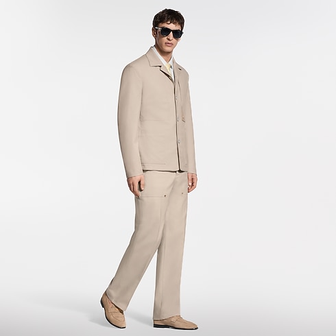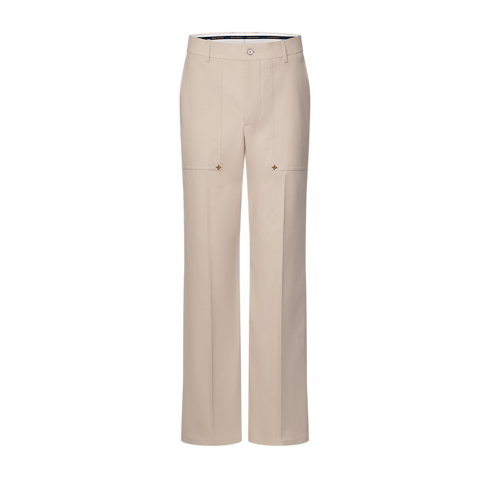 Die Silhouette dieser eleganten, beigefarbenen Hose im Maßkonfektions-Stil ist von Workwear inspiriert. Das Modell aus einem stilvollen Bio-Baumwoll-Seidengemisch verbindet Atmungsaktivität mit einem zarten Schimmer. Zwei große aufgesetzte Taschen auf der Vorderseite sind mit goldfarbenen Nieten in der Form von Monogram-Blüten versehen. Die Rückseite des Taillenbunds ziert eine gewebte LV Signatur. Ein passendes Jackett vervollständigt ein modische Ensemble für frühlingshafte Tage.
