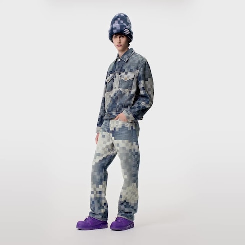 Diese Hose aus grafischem Denim zeigt das ikonische Damoflage-Motiv der Frühjahr Sommer 2024 Fashion Show. In die verwaschenen Indigotöne sind mithilfe einer raffinierten Jacquard-Technik „Marque L. Vuitton Déposée“ Signaturen integriert. Ein juwelenartiger Verschluss ziert dieses legere, einzigartige Modell, welches sich mit einem passenden Jackett aus Denim zu einem Look vom Laufsteg kombinieren lässt.